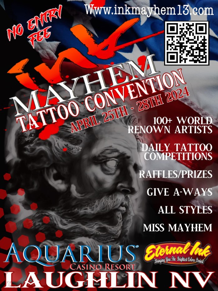 4 days of tattoos, competitions, awards, give-a-ways, and raffles. With prizes like ink mayhem gear, tattoos, room stays and more, there will be entertainment, including music, piercing and tattoo demonstrations. We will have live tattooing with award winning tattoo artists from around the globe. the artists will be there for you to meet and talk to, browse through their portfolios. A tattoo can be done to your specifications right there on the spot. a lucky winner will recieve complimentary room accomodations for 2 at the host hotel for the next years event